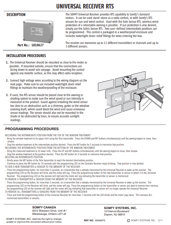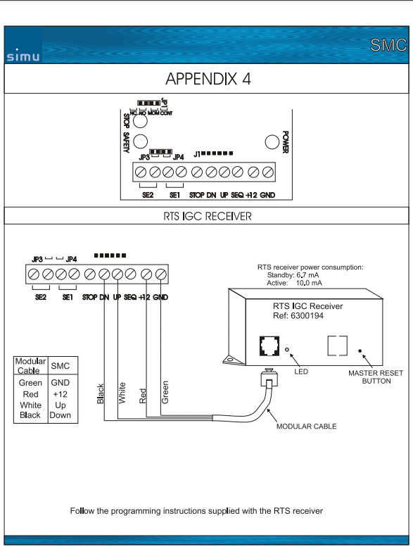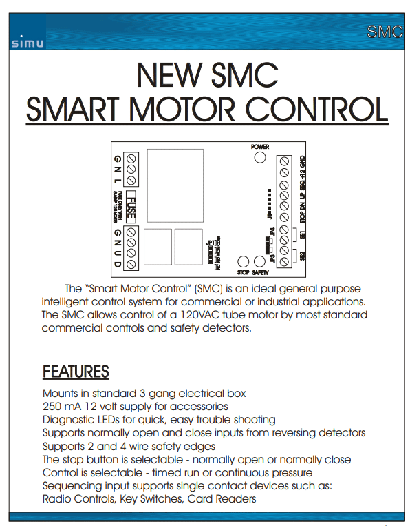 Somfy Motors Documentation SMC Smart Remote Control Download Altus Quick Guide Download CDR 863 with SMC (CDR 863 Infrared Eye Beam) Download Switch Paddle Momentary wiring diagram Download Universal Receiver RTS Download SMC RTS IGC Receiver Download Switch Paddle Momentary BASIC Wiring Diagram Download Keyswitch BASIC Wiring Diagram Download Somfy SMC / Smart Motor Controller BASIC Wiring Diagram Download